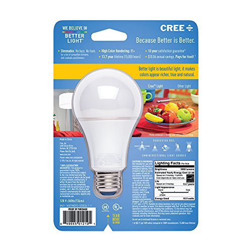 Studio : Cree Publisher : Cree Binding : Tools Home Improvement Product Description For people who aspire to create a beautiful and safe home for their family, the 100W equivalent Cree® LED bulb provides better light, better dimming, all backed by a better warranty. Featuring a warm (2700K), omnidirectional light with high color rendering, the Cree LED bulb is designed to enhance your home and make the colors of your decor appear vibrant, richer and more natural. Fully dimmable and built to light and last, the new Cree LED bulb provides 13.7 years (15,000 hours) of beautiful, energy-efficient light. The energy star® certified Cree LED bulb is a worry-free choice backed by one of the strongest warranties in the industry ? a 10 year 100% SATISFACTION guarantee. 0