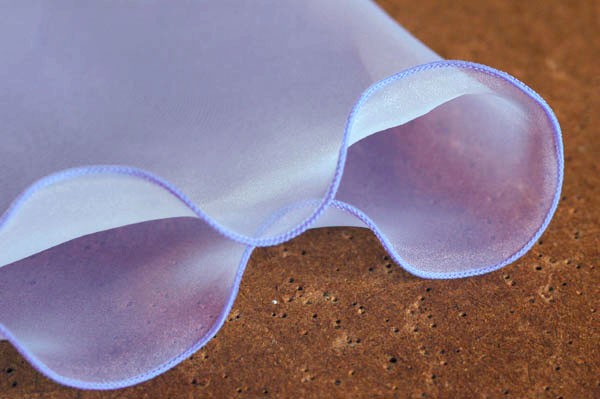 さまざまなバリエーションをお楽しみいただけるリーフデザインです。(えんぴつのように両端がとがっています) シンプルなオーガンジーショールですが、贅沢にバイアスで裁断し、ふちが波打つようにデザインしています。