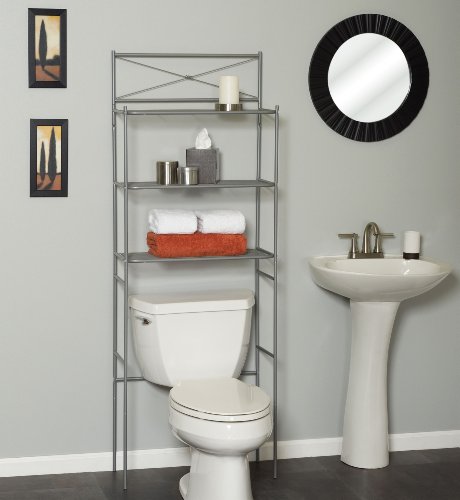 - Feature : Criss-cross design and satin nickel finish provide simple elegant appeal / Three large wire shelves provide space for storage or display / Steel construction ensures long lasting durability / Space-efficient shelving utilizes wasted storage area over the toilet / Easy to assemble