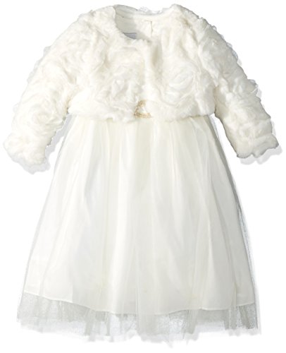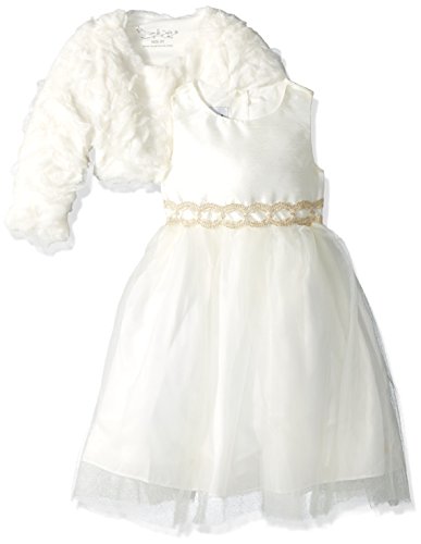 Everyone at the family reunion will insist that your girl looks so grown up in this elegant, all-ivory outfit.She'll love twirling on the dance floor in her tulle tutu skirt, and the shantung bodice will show a special sheen under the disco ball.When she puts on her plush, faux fur bolero once it's time to head home, she'll really feel grown up, too.Feature