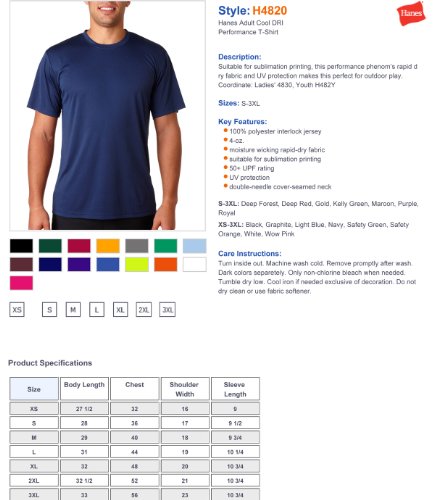 Studio : Hanes Publisher : Hanes Binding : Apparel Product Description Suitable for sublimation printing, this performance phenom's rapid dry fabric and UV protection makes this perfect for outdoor play, 100% polyester interlock jersey, 4-oz., moisture wicking rapid-dry fabric, suitable for sublimation printing, 50 UPF rating, UV protection, double-needle cover-seamed neck, Sizes: S-3XL. 0