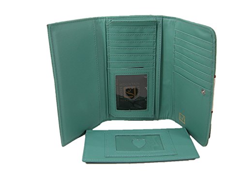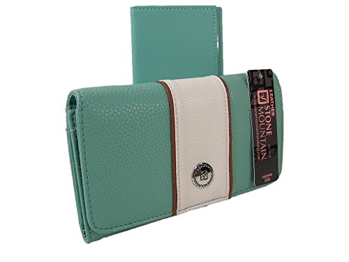 Product Description 2 Piece Set = 1 Wallet 1 Checkbook Cover Mint (ice blue) and tan exterior in genuine leather. Stone Mountain logo on the front of the bag in silver. Front flap closure. Interior ID window, 13 credit card slots and 4 larger slip pockets. Exterior zipper pocket for change. Measurements: Approximately 7 "W x 4"H. Matching checkbook cover with an additional ID window. Tag Information: Pebble Slg Ice Blue/Bone/Tan 8AF138-2 0