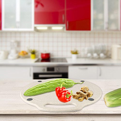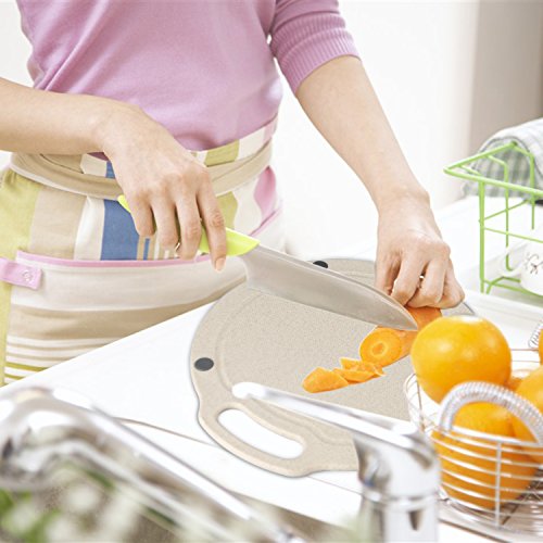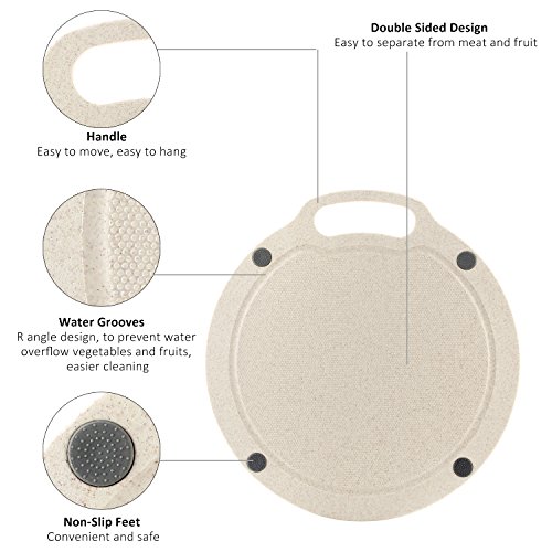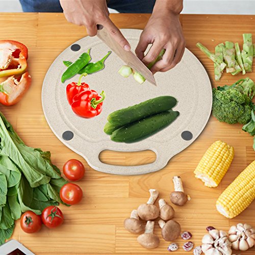- GREAT FOR FOOD SAFETY: High quality cutting board made of natural organic wheat straw + starch + food-grade PP, non-toxic and environmentally friendly, toxin free and natural anti-bacterial, anti-Microbial. A selection of natural organic delicately scented wheat plant fiber, healthier for your family. Non-porous (unlike wood/Bamboo). New biodegradable material, which will decompose in the soil. Won't splinter, crack or peel. Won’t retain odors or dull your knives, protects the counter tops.