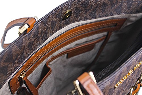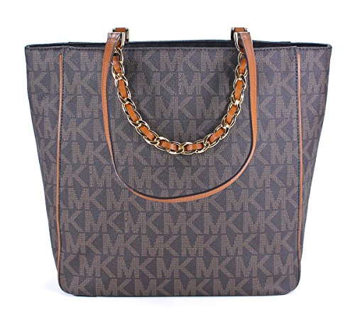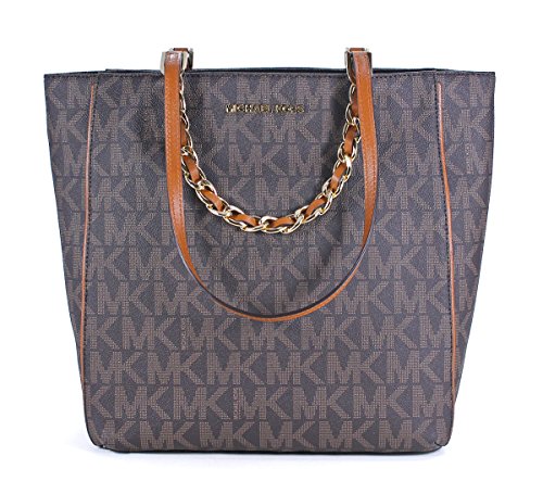 -. Brand : MICHAEL Michael Kors -. Color : Brown -. Department : womens -. EAN : 0736983876553 -. Feature : Made of MK Signature PVC, leather trim and Gold hardware / Raised logo on front - Gold chains with interwoven leather hangs off front and back / Double flat leather handles - Magnetic snap closure / Five interior pockets, key leash, and padded zip pocket in center for iPad or tablet / 11.5"W x 12"H x 4.5"D - Drop = 10.5" -. ProductGroup : Shoes -. ProductTypeName : HANDBAG -. Title : MICHAEL Michael Kors Large Harper N/S Tote in Brown -. UPC : 736983876553