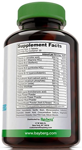 -. Feature : Vitamin B1 helps the body make healthy new cells. It's often called an anti-stress vitamin because of its ability to protect the immune system. Vitamin B2 (Riboflavin) works as an antioxidant. Vitamin B6 (Pyridoxine) is a major player in mood and sleep patterns because it helps the body produce serotonin, melatonin and norepinephrine. Vitamin B12 is vital in coping with depression and anxiety. At the same time it also supports neurological and cognitive functioning. / Vitamin C is an essential part of stress management. It is one of the most effective and safest micronutrients. It is a powerful antioxidant which helps to make blood vessels and body muscles strong. Reduces cholesterol levels naturally. People who have high levels of vitamin C bounce back from stressful situations faster than people with low levels of vitamin C in their blood. / Magnesium is an excellent anti stress mineral for those who experience excessive nervousness. Used for poor sleep, anxiety, spasms, high blood pressure, and abnormal heartbeats. Combined with calcium can significantly lower blood pressure. Our Herbal Blend is a natural Mood Supporter that soothes the mind. Stay positive, calm and focused with Bayberg's Anxiety Relief and Stress Support Supplement. / Made in the USA, Non-Gmo and Gluten Free! No hormones, no antibiotics, no preservatives, no artificial ingredients or flavors. Made in a GMP-Certified and FDA-Approved facility. / 100% SATISFACTION GUARANTEED or your money back!. Stress Reduction Pills for men and women. Multivitamin (vitamin b and c), keep your energy and stay relaxed! Advanced health complex.