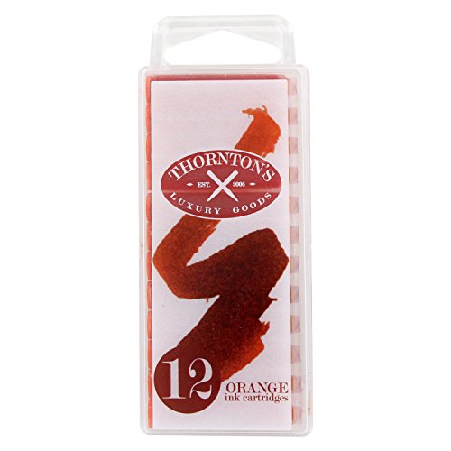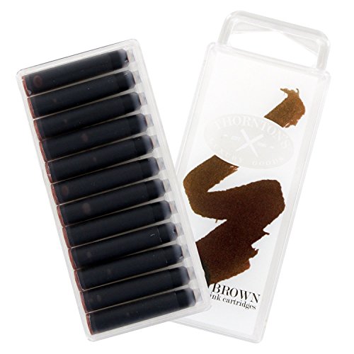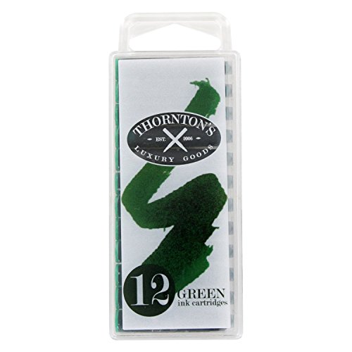 -. Binding : Office Product -. Brand : Thornton's Luxury Goods -. Feature : Thorntons ink cartridges have a neutral PH, excellent coverage, smooth flow. / The standard cartridges fit almost every cartridge/converter fountain pen on the market. / The 12-pack features a plastic reclosable case that will help preserve the life of the unused cartridges. / Each ink cartridge is 38.46mm long and 7.06mm in width. -. Label : Thornton's Luxury Goods -. Manufacturer : Thornton's Luxury Goods -. PackageQuantity : 1 -. ProductGroup : Office Product -. ProductTypeName : OFFICE_PRODUCTS -. Publisher : Thornton's Luxury Goods -. Studio : Thornton's Luxury Goods -. Title : Thornton's Short Standard Fountain Pen Ink Cartridges, Pack of 144