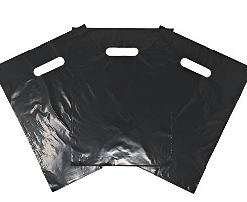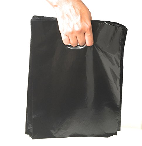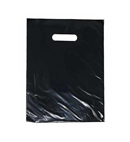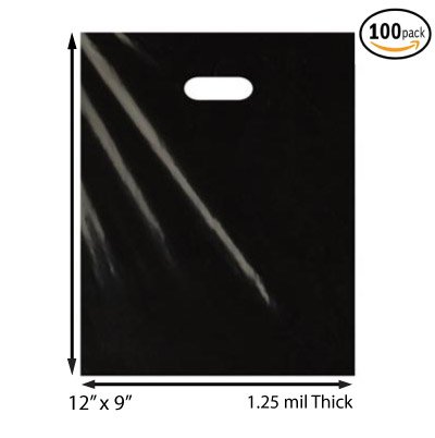 100 Pack 9" x 12" with 1.25 mil Thick Black Merchandise Plastic Glossy Retail Bags | Die Cut Handles | Perfect for Shopping, Party Favors, Birthdays, Children Parties | Color Black | 100% Recyclable