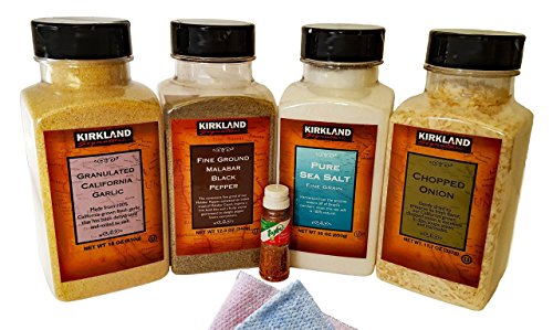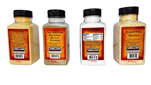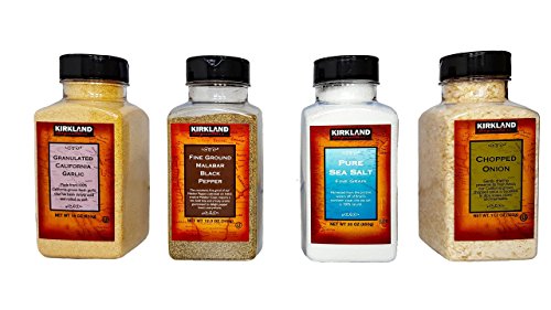-. Feature : Kirkland SignatureTM California Granulated Garlic. / Pure Sea Salt 100% Natural. / The consistent, fine ground of our Malabar Pepper, cultivated on India's tropical Malabar Coast, imparts a hot, bold bite and a fruity aroma guaranteed to delight pepper lovers everywhere. / California grown chopped onion.