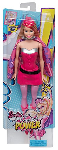 In Barbie in Princess Power movie, a modern-day princess is kissed by a magical butterfly and discovers she has super powers. Will she join forces with her “super” friends and rid the kingdom of its enemy? Girls will love playing out this story and others with this inspiring superhero doll. Dressed as her superhero alter-ego, Super Sparkle, this doll is ready to save the day! She wears her signature superhero costume: pink shiny bodice with silvery trim, fashionable pink skirt accessorized with every superhero’s favorite accessory -- the utility belt (not removable) -- and tall pink boots. A star-printed cape and pink mask are powerful accessories for this modern-day princess turned save-the-day superhero. Girls can recreate favorite scenes and imagine new adventures with this super superhero doll! Includes doll wearing fashion and accessories. Doll cannot stand alone. Ages 3 and older.Feature