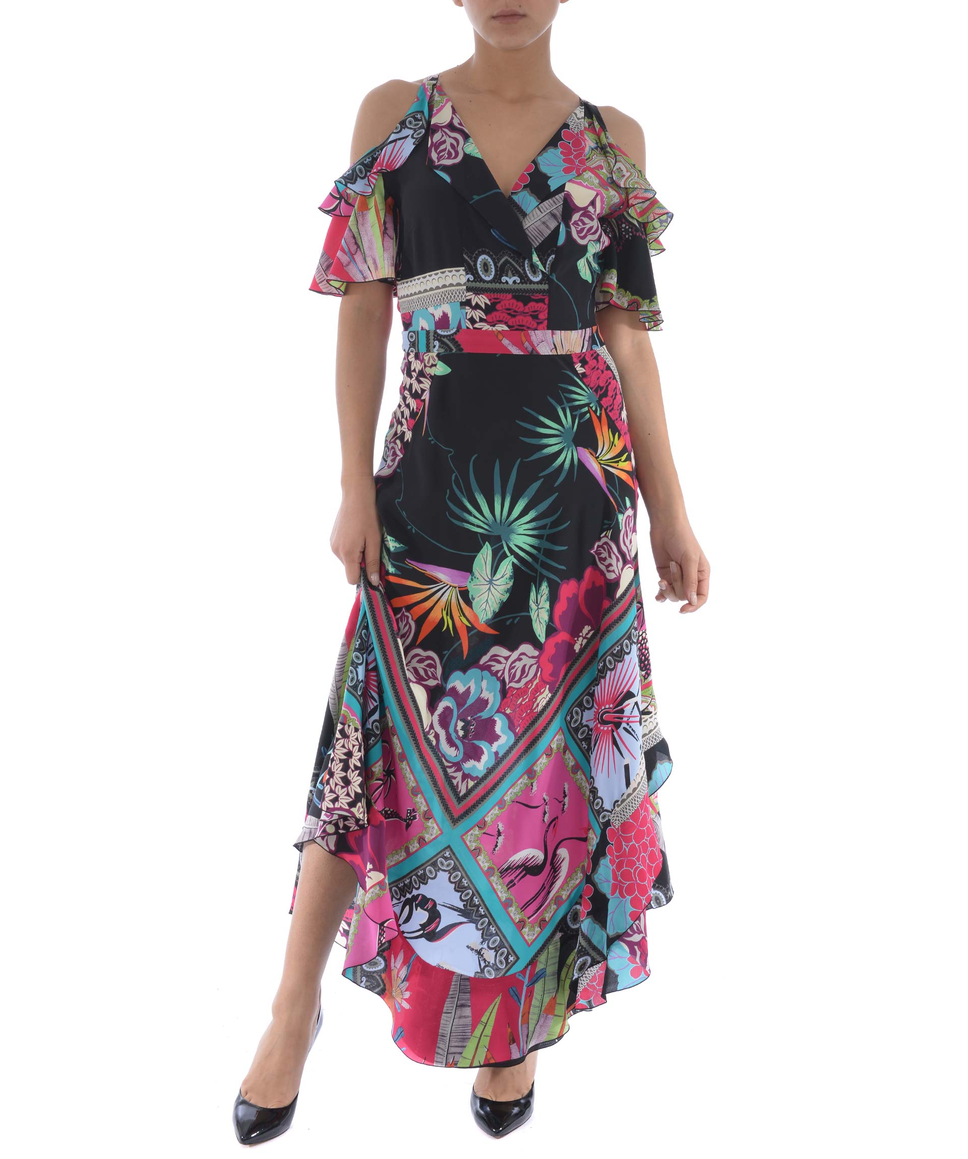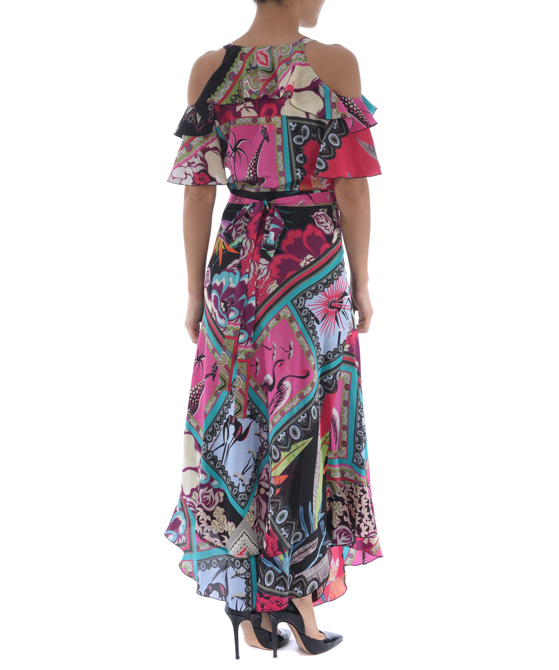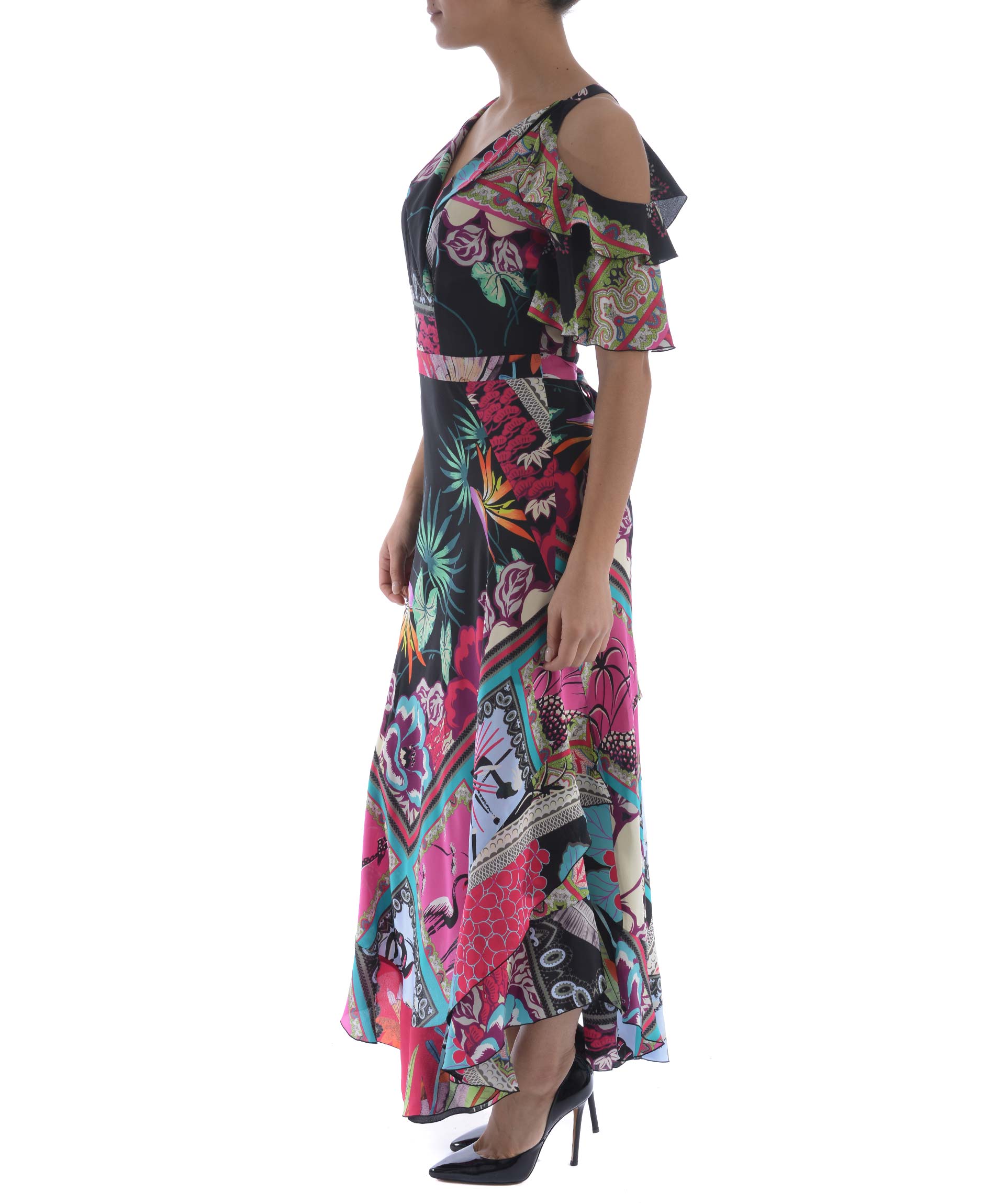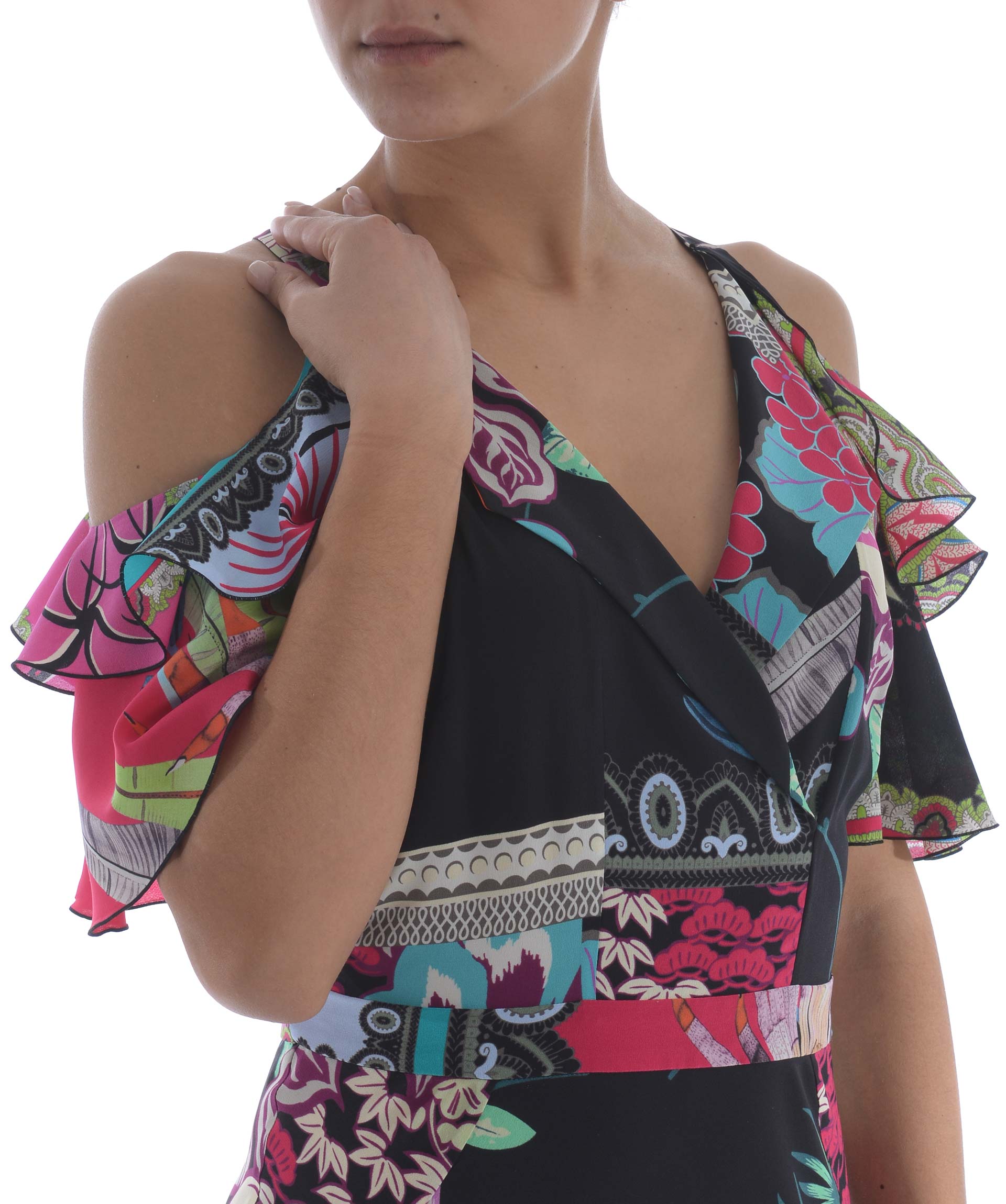 Ruffled Dress from Etro: Multicolor Ruffled Dress with V-neck, off shoulder design, printed design, curved hem and ruffled design.