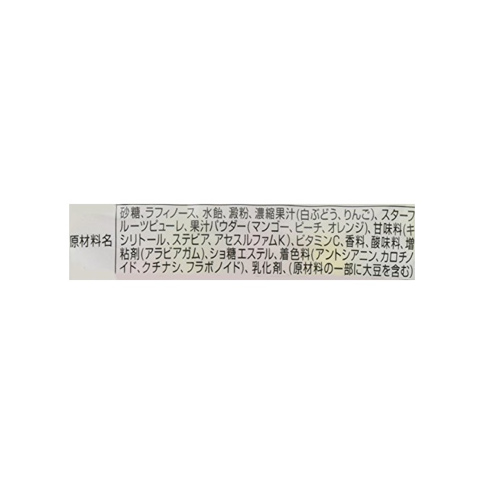 원재료:설탕,러프《노스》,수 엿,전분,농축 과즙(백# 어떻게(아무리),사과)고, 덱스트린,스타 후루츠 퓌레,과즙 파우더(망고,피치,오렌지)고, 감미료(기시리토루,스테 비어,assessment《루후무》K)고, 비타민C,향료,신맛료,증점제(아라비아 껌)고, 《쇼》당 에스테르,착색료(앤《도시아닌》,치자나무,카로 치노 이 드,후라보노이드)고, 유화 제,(원재료의 일부에 대두를 포함한다)