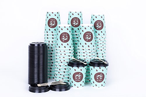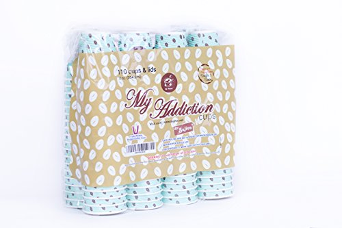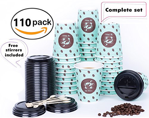 PREMIUM QUALITY AND QUANTITY: You receive a pack of 110 Premium Quality Coffee cups with Lids and Stirrer! Suitable for Americano's, Latte's, Cappuccinos, Espresso's and the famous and delightful winter warmer.. Hot Chocolate!