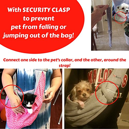 -. Feature : ✔ WITH SECURITY CLASP FOR YOUR PET'S SAFETY - Our pet sling bag also includes a collar hook that links to your pet's collar and prevents them from jumping out of the dog carrying bag! / ✔ ADJUST THE PET SLING CARRIER'S STRAP WITHOUT HURTING YOUR SHOULDER - You don't have to worry anymore about your height, since the strap can easily be adjusted before or while carrying your pet. Unlike metal buckles, our adjusting mechanism is very comfortable and easy to use! / ✔ NO NEED TO CARRY AN EXTRA BAG WITH YOU - We have included a zippered pocket right under the adjustable strap. You can carry anything with you on your walks with your dog, for example treats, poo bags, water, your wallet, cell phone or keys. / ✔ FREE E-BOOK INCLUDED - It's our mission to take care of your pet's problems and also help you overcome them. Many puppies deal with anxiety from a variety of reasons. You'll receive our well informed e-book on how to treat separation anxiety in your dog or puppy for free. / ✔ GUARANTEED HIGH-QUALITY - Our 100% cotton-made sling bag carrier is both durable and suitable for small to medium sized dogs and cats. It's also machine washable and you can easily clean it every time it gets dirty or just turn it the other side (grey or pink).