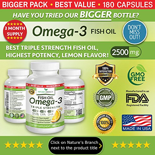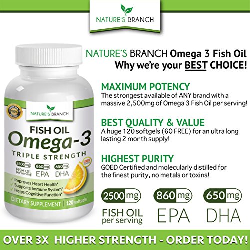 ★ THE BEST PREMIUM OMEGA 3 FISH OIL PILLS ★ The highest concentrate, 2500mg triple strength, molecularly distilled premium Omega 3 softgels delivering 1640mg ESSENTIAL FATTY ACIDS in every serving with 120 lemon flavor, burpless capsules in every bottle! Our unique pills contain OVER 3X MORE FISH OIL than other leading brands!