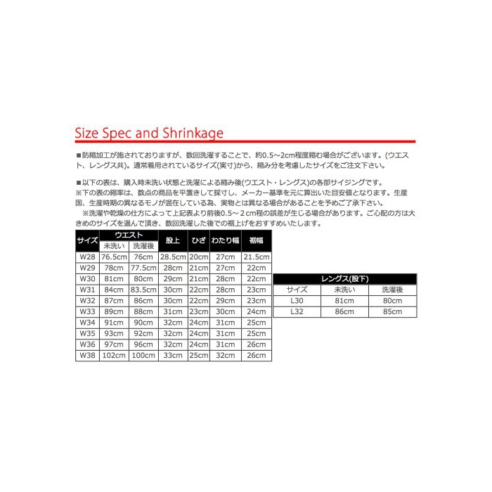 ■방축가공이 행해져 있습니다만,몇차례 세탁 하는 것으로,약0.5~2cm정도 줄어드는 경우 (이)가 있습니다.(웨스트,길이모두).통상 착용 되고 있는 사이즈(실치수)부터,줄어듦분을 고려한 사이즈를 주문 주십시오.