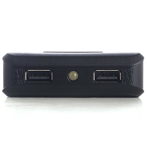 High capacity 15,000mAh Lithium-ion battery charges two devices simultaneously. Input: 5V/1A (max), Outputs: 5V/1A and 2.1A (max). Universally compatible.