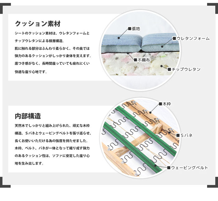 ●材質:張地/ポリエステル、綿内部/木枠、ウレタン、スポンジ、Sバネ、不織布フレーム/天然木、ラッカー塗装