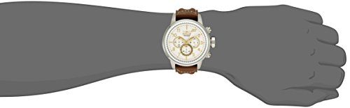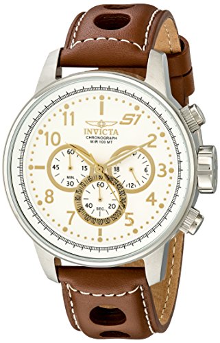 Invicta 16010 S1 Rally chronograph men's watch features a 48mm wide and 13mm thick solid stainless steel case with a fixed bezel and textured push-pull crown with function pushers. Invicta 16010 is powered by a precise Japanese TMI VD54 quartz chronograph movement. This stylish watch also features a sharp looking milky white dial with white accents gold tone luminous hands and Arabic numeral hour markers along with the chronograph and 12/24-hour time display functions, scratch resistant flame fusion crystal and water resistant to 100 meters. Invicta 16010 is equipped with a 22mm wide genuine brown leather strap with a buckle clasp. Invicta 16010 men's S1 Rally white dial chronograph brown leather strap watch is brand new and comes in an original Invicta gift box and is backed by a 5 years limited warranty.Feature