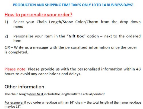 -. Binding : Jewelry -. Brand : My Name Necklace -. Feature : Personalize this bracelet with up to 1 name / Next, Click on / Takes between 10-14 business days to arrive! / Names can be up to 10 letters with the first letter capitalized -. Label : Custom Personalized Jewelry -. Manufacturer : Custom Personalized Jewelry -. ProductGroup : Jewelry -. ProductTypeName : FINENECKLACEBRACELETANKLET -. Publisher : Custom Personalized Jewelry -. Studio : Custom Personalized Jewelry -. Title : Side Heart Name Bracelet / Anklet - Custom Made with Any Name!