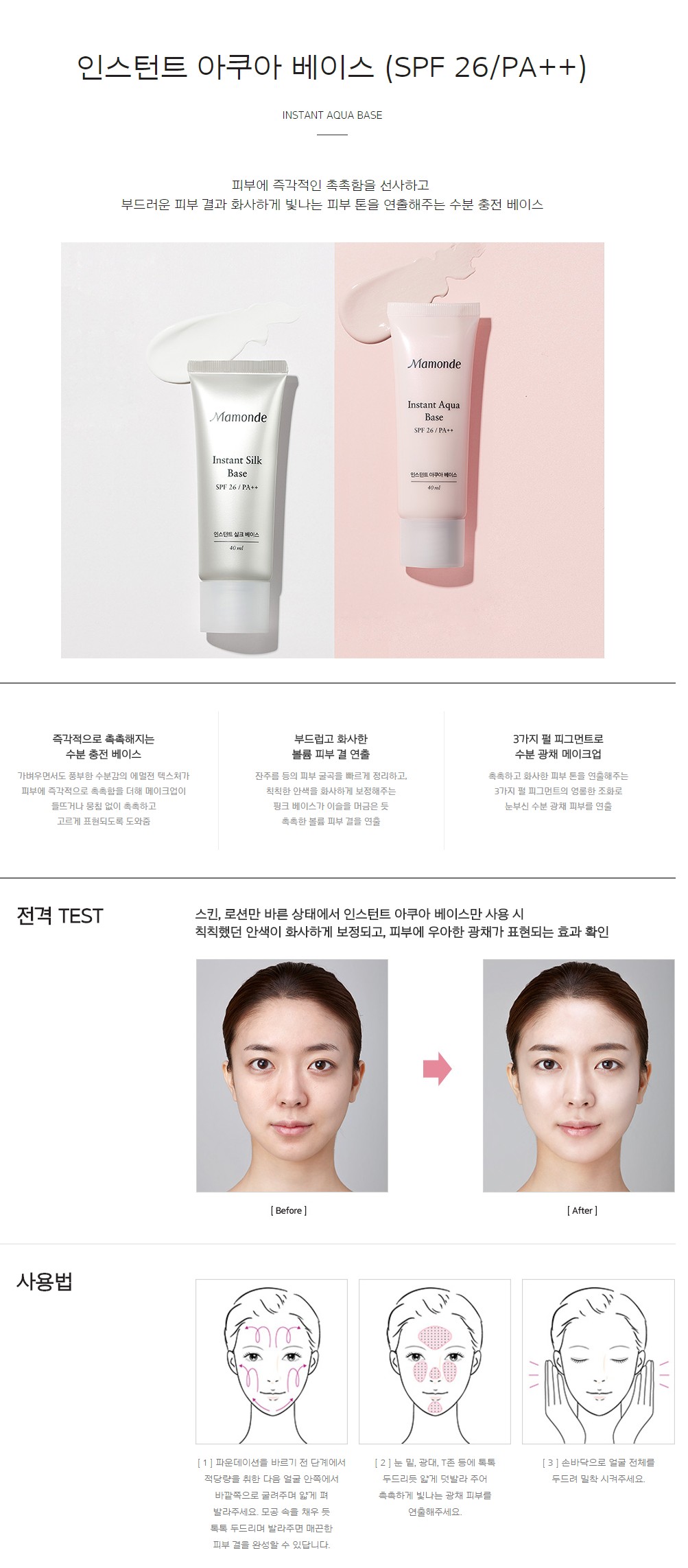 Light and moist emulsion texture immediately moisturizes the skin evenly. The pink base smoothens the rough skin and brightens the dull skin quickly. 3 pearl pigments expreses the skin moist and bright with a moisture glow.