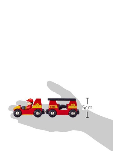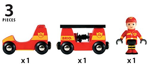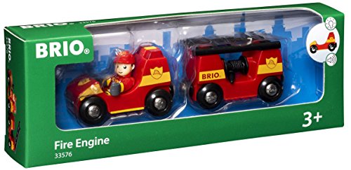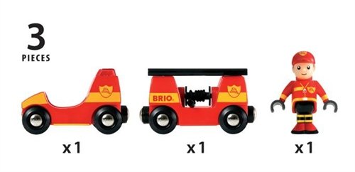 -. Binding : Toy -. Brand : Brio -. EAN : 7790020105566 -. Feature : 3 pieces; Fire engine, fire train car, Fire Chief Brio figure / Rush to the fire, uncoil the fire hose, climb the ladder and put out the fire / Push the button for realistic lights and sound effects / Works with all Brio and other wooden railway sets / For ages 3 and above -. IsAdultProduct : 0 -. ItemPartNumber : BRI-33576 -. Label : Schylling -. Manufacturer : Schylling -. Model : 33576 -. MPN : 33576 -. NumberOfItems : 1 -. PackageQuantity : 1 -. PartNumber : 33576 -. ProductGroup : Toy -. ProductTypeName : TOYS_AND_GAMES -. Publisher : Schylling -. SKU : B006IOCS0W -. Studio : Schylling -. Title : Brio Fire Engine Train Set -. UPC : 783329037666 -. Warranty : No Warranty