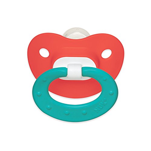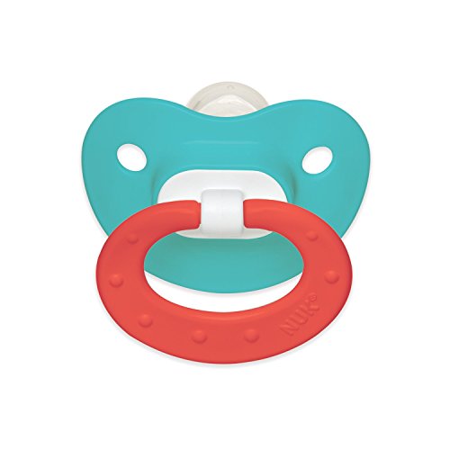 -. Binding : Baby Product -. Brand : NUK -. Color : Pink/Aqua -. EAN : 0713331131281 -. Feature : Juicy Pacifiers with classic puller and bright vivid colors with no design / Features our improved nipple that soothes and calms baby better than our original nipple and an asymmetrical shape that helps promote healthy oral development by naturally fitting into your baby's palate / Scoop nipple cavity allows maximum tongue movement, which gently exercises your baby's tongue, palate and jaw and promotes proper teeth alignment by helping your baby avoid thumb-sucking / Heart shaped shield fits perfectly under baby's nose for easy breathing and less irritation / BPA free with silicone orthodontic nipple and made in the USA -. Label : NUK -. Manufacturer : NUK -. PackageQuantity : 2 -. ProductGroup : Baby Product -. ProductTypeName : BABY_PRODUCT -. Publisher : NUK -. Size : Size 2 -. Studio : NUK -. Title : NUK Juicy Puller Silicone Pacifier in Pink/Aqua, 6-18 Months -. UPC : 713331131281