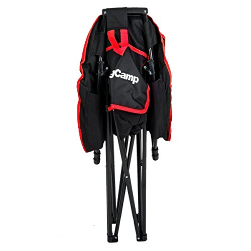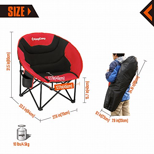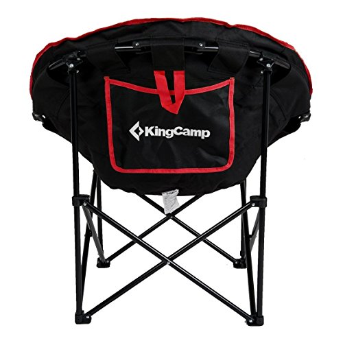 -. Binding : Misc. -. Brand : KingCamp -. Feature : Padded seat for all-around seat coverage for extra comfort / Large pocket on the back of the chair can hold magazines and personal items for indoor and outdoor use / Storage bag with shoulder strap for easy carry / Sturdy steel frame construction,weight capacity up to 260 lbs / Folds up in seconds, with handles on the back of the seat. Looking for a chair for your kids? Try to search ASIN: B01MSYXKC2 -. IsAutographed : 0 -. IsMemorabilia : 0 -. Label : Kingcamp -. Manufacturer : Kingcamp -. ProductGroup : Sports -. ProductTypeName : SPORTING_GOODS -. Publisher : Kingcamp -. Studio : Kingcamp -. Title : KingCamp Moon Saucer Camping Leisure Chair with Cup Holder Steel Frame Folding Padded Round Portable Stable with Carry Bag