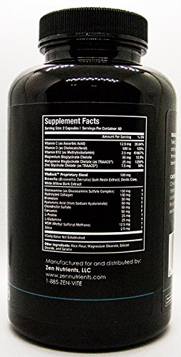 POWERFUL, PROPRIETARY HERBAL SYNERGISTIC PAIN BLEND. Ingredients include: Boswellia, Devil's Claw, White Willow Bark, Glucosamine, Chondroitin, MSM, Collagen, Hyaluronic Acid, Curcumin, Bromelain, L-Proline, L-Glutamine, Zinc, Magnesium, Manganese, Vitamin C, Vitamin D, Vitamin B12, and Silica.