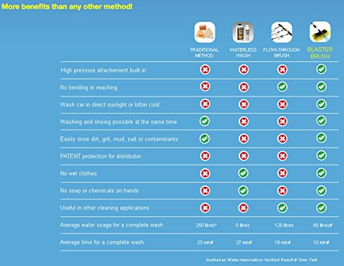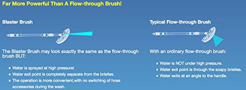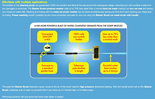 The amazing new patented Blaster Brush combines the power of a pressure washer, with a super soft scrubbing head, all in one. All you need is a bucket, car shampoo and the Blaster Brush cleaning brush. All you need to do is just hook up the Blaster Brush to a garden hose. No more sponges, chamois, chemicals, fancy useless gadgets or other messy car wash equipment. The powerful blast of water is separate from the soapy bristles, which allows you to blast away the heavy dirt in seconds before scrubbing. Turn the water off using the handle switch, and use the large soft bristle head to gently scrub away the fine film of dirt. And then instantly turn the power jet back on to blast away the suds for a super quick rinse. Any stubborn grime on the car can be safely blasted off with complete ease using the power sprayer. No more scrubbing tirelessly away at mud, salt and filthy wheels and grills. It's your first line of defense from corrosion and exterior surface damage. You'll be amazed that you can wash your entire car in less than 10 minutes! And you'll use up to 75% less water. Best of all, No getting wet, No bending, No reaching...just blast away. Once your car is done, use the Blaster Brush all around your home.The car wash brush can be used to clean refuse bins, boats, trailers, driveways, barbeques, lawn mowers, 4x4s and the list doesn't end there: Boats, Campers, 4x4s, Trailers, Home windows, Facia boards, Paving, Driveways, Decks, Outdoor furniture, Barbeques, Bicycles, Lawnmowers, Refuse bins, And much more! The uses are endless.