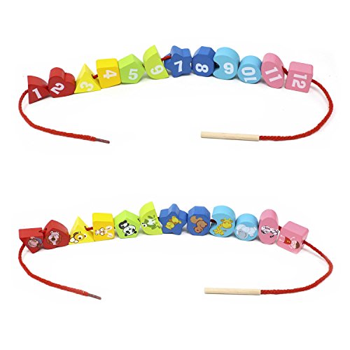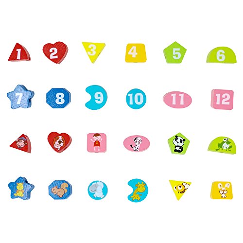 Features The blocks has patterns both side.One side is numbers,another side is animals.6 colors and 12 shape.And you will find there also patterns in the hole when you remove the block.The package also include a rope which can thread block as a lacing threading games.