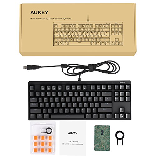 -. Feature : LED-Backlit Mechanical Keyboard: 6-color backlight (each row has a different specific color), 9 preset lighting effects, and 2 slots for assignable lighting effects. Choose a preset effect or customize your configuration to match your computer setup / Out Blue Switches: The individual, clicky Out Blue switches deliver accurate, responsive key commands for typing and gaming. They have an incredible 50-million-keystroke lifespan, proven in testing / Full N-Key Rollover: 87-key rollover means this keyboard will never miss a single key-press or confuse your commands in any use case scenario / Durable & Water-Resistant: The double-shot-molded ABS keycaps and brushed metal panel are extremely durable and abrasion-resistant. Protection against accidental spills provides extra peace of mind / Package Contents: AUKEY KM-G7 LED-Backlit 87-Key Mechanical Keyboard, Nine Gaming Key Alternative Keycaps, Two Keycap Pullers, User Manual, 45-Day Money Back Guarantee and 24-Month Product Replacement Warranty Card