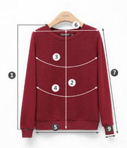 | 尺码 | ①前衣长 | ②后中长 | ③胸围 | ④腰围 | ⑤下摆围 | ⑥肩宽 | ⑦袖长 | ⑧袖臂围 | ⑨袖口围 | ||