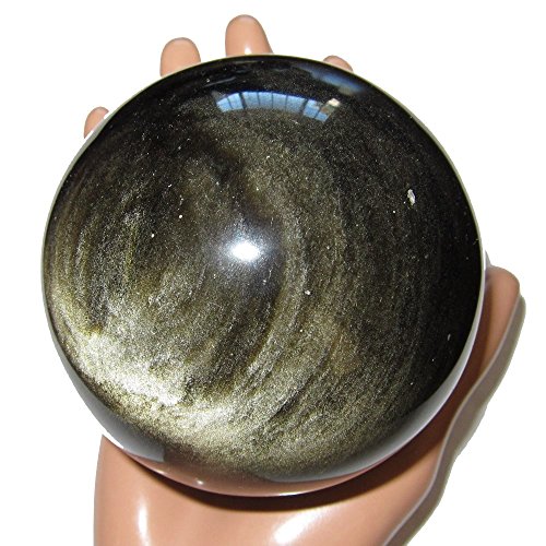 Your large and deluxe sphere is made from obsidian, which is volcanic glass. It appears black in normal lighting, with some white dimples and snowflake markings natural to obsidian. When placed in direct sunlight or very bright lighting, the sphere reveals wonderful gold sheen sparkles. One of a kind protective sphere hand picked by Satin Crystals for you, in a hard to get jumbo size. Receive this exact stone pictured when you order from Satin Crystals.