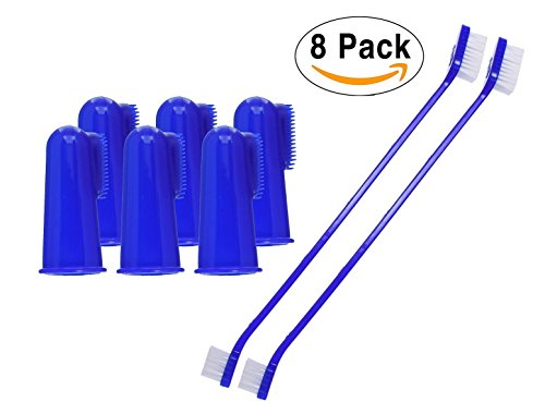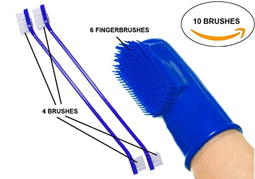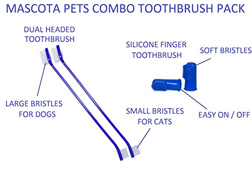 10 BRUSH VALUE PACK: Mascota Pets dog / cat toothbrush designs allow for easy and safe brushing of your pet's teeth. More than 90% of pet owners polled agree that for general dog / cat teeth cleaning, the Finger Brush is both safer and more efficient than a standard toothbrush, allowing for a quick brushing of your pet's teeth and gums. The Long Handled Cat/ Dog Toothbrush is dual headed with 4 brushes and is more efficient to brush and clean in the far reaching corners of your pets mouth.