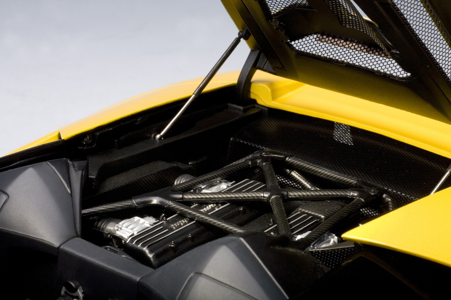 Inside the engine room is reproduced on an elaborate V12 engine up to an optional carbon cross member.