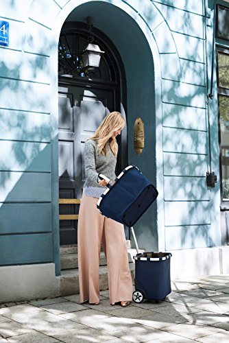 2-stage telescopic handle for height adjustment; adjustable, padded shoulder strap; large, smooth turning wheels; plastic feet for self-standing support; includes fixtures for attachment to grocery shopping carts