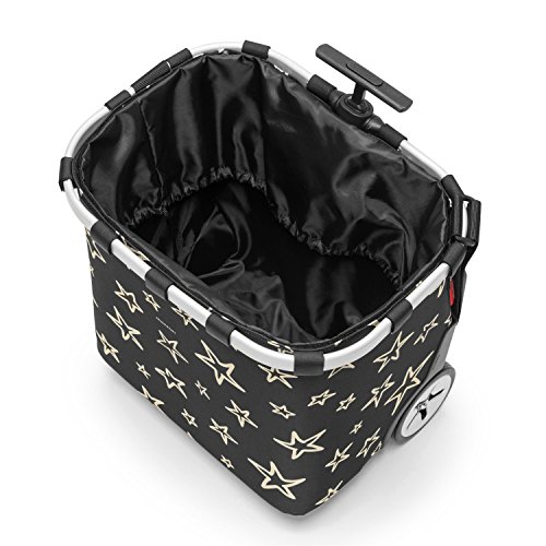 Sturdy aluminum frame; removable mesh inner pocket; removable, washable lining with toggle fastener; water-repellent; features a unique stars print