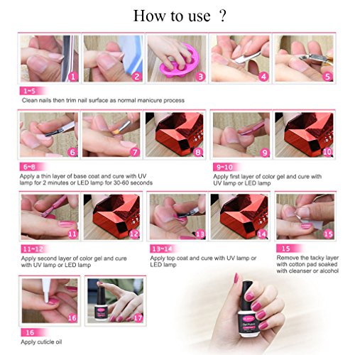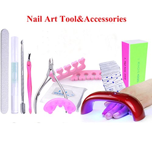 -. Feature : PACKAGE:18pcs Gel polish starter kit,includings 4pcs color gel polish,1pc top coat 1pc basecoat,1pc 9w led lamp, 11pcs nail art tools and accessories / PORTABLE:Mini UV LED nail light lamp and useful nail art tools easy for carry or storage / FEATURE:Perfect for at home persoanl use or carry for travel use also can for professional salon beauty shop starter/beginner practice / CURE TIME: Average for LED light 30-60 secs, UV light 2-4 mins / SUITABLE:For natural nails, UV gel nails, false nails, acrylic nails, nail tips, etc