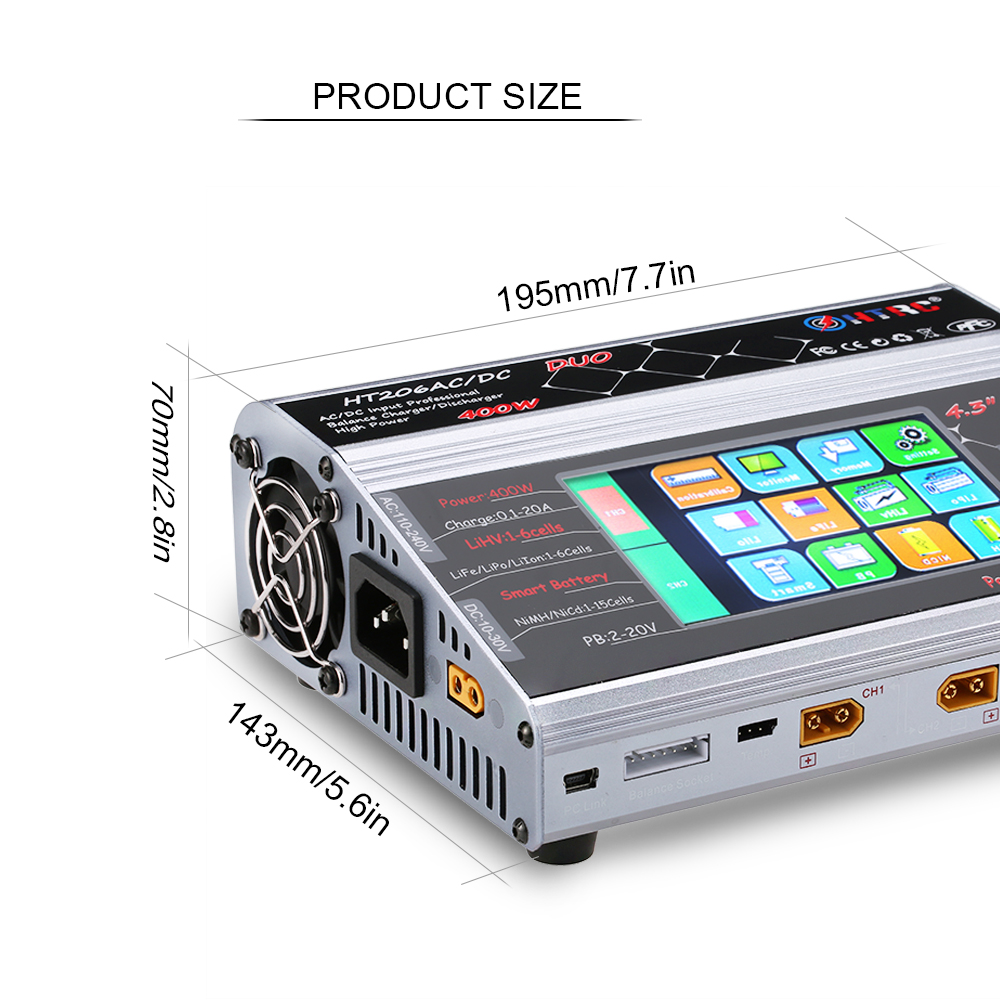 Designed by professionals, this system is extremely versatile. This charger with special vertical appearance , and it has 4.3" display touch color screen for you to easy operation and convenient to use. Besides, it also with rudder pads, so it can prevent sliding and the air can circulate. It's for a variety of batteries, it also has independent input and output, its max charger power is 400W and max discharger power is 50W. With balance function, it can protect battery life. So it is very useful for you, come and get its soon.