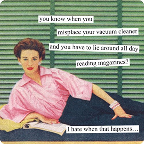 - Features the saying: you know when you misplace your vacuum cleaner and you have to lie around all day reading magazines? I hate when that happens…"