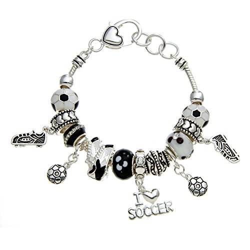 -. Feature : Has a heart shaped lobster claw clasp and will fit up to a 7.5 inch wrist / Several Soccer charms including shoes, soccerballs, and an I love soccer charm / Bracelet measures 7.5 inches long / Comes in gift box / Imported