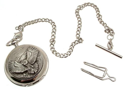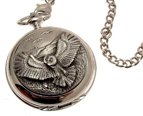 -. Title : Pocket watch - Solid pewter fronted mechanical skeleton pocket watch - Owl design 42