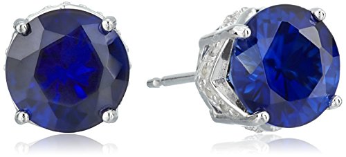 Rhodium Plated Sterling Silver Round Created Blue Sapphire and Create White Sapphire Stud Earrings