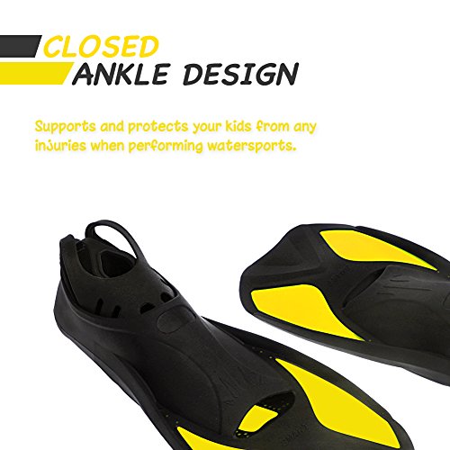 CLOSED ANKLE DESIGN - The closed ankle design supports and protects your kids from any injuries when performing watersports. The pool fins have 9" foot length which is equal to US size of 3-4.