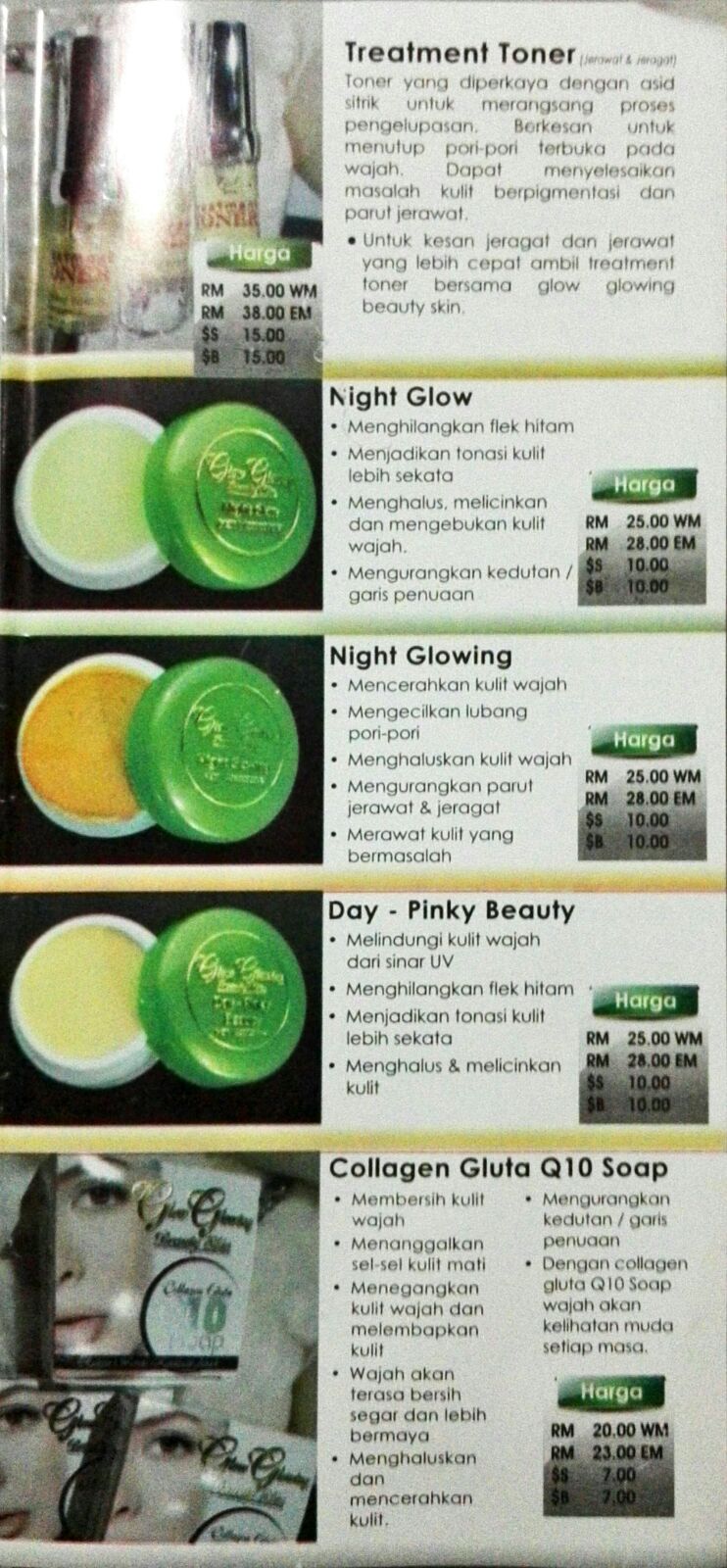 *Untuk muka berjerawat / berjeragat boleh start dengan krim night glowing 3 hari dan seterusnya 3 hari krim night glow.