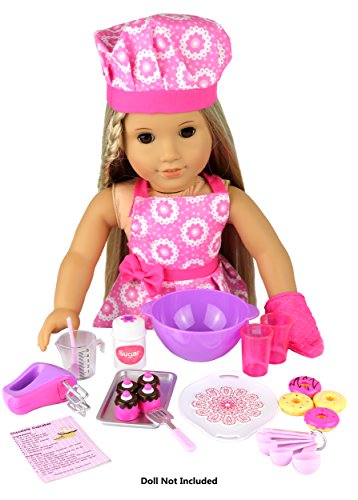 - Feature : Full set of baking accessories for dolls. Perfectly sized to fit your 18 inch doll like the American Girl. / Set includes; Mixer, Mixing Bowl, Recipes, Spoon, Spatula, Measuring Spoons, Measuring Cup, Canisters for Ingredients, Apron, Chef Hat, Mittens, Donuts, Cupcakes and more. / An amazing gift for every girl. Doll & Doll Outfit Not Included. All is made of top quality for years of enjoyment. / Cupcake tray and bite size cupcakes, cookie tray and bite size cookies. / Great pretend play to keep your kids busy for hours. Not affiliated with American Girl®, Reg. Trademark of American Girl, LLC.