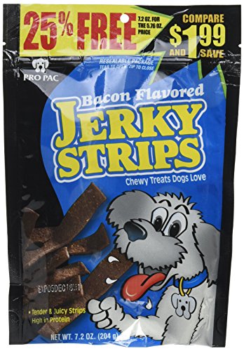 -. Feature : (3 Pack) PRO PAC Bacon Flavored Jerky Strips Dog Treats, 7.2-Ounce Bags / Perfect for smaller dogs that favor softer goodies / A nutritious snack for dogs / Crude Protein, not less than 270-percent Crude Fat, not less than 100-percent / Crude Fiber, not more than 30-percent