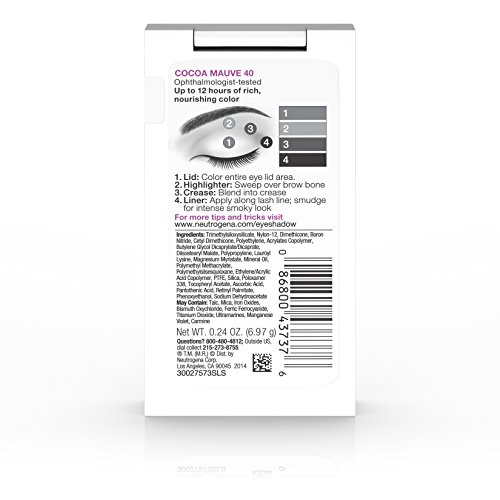 Use Neutrogena Nourishing Long Wear Eye Shadow + Built-in Primer to enjoy up to 12 hours of rich, nourishing eye shadow color. This eye makeup features built-in eyelid primer that helps prevent creasing and smudging for beautiful eye shadow color that lasts. The formula is infused with vitamins and skin-nourishing conditioners for the delicate eye area. This eye primer is ophthalmologist tested and safe for sensitive eyes.Feature
