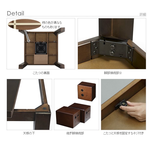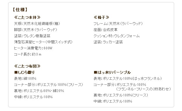 材質:こたつ天板-天然木化粧繊維板(楢)、こたつ幕板・脚部-天然木(ラバーウッド)、椅子本体-天然木(ラバーウッド)、布団表地-しじら/綿100%、レンガ・ベージュ/ポリエステル100%(撥水フランネル)