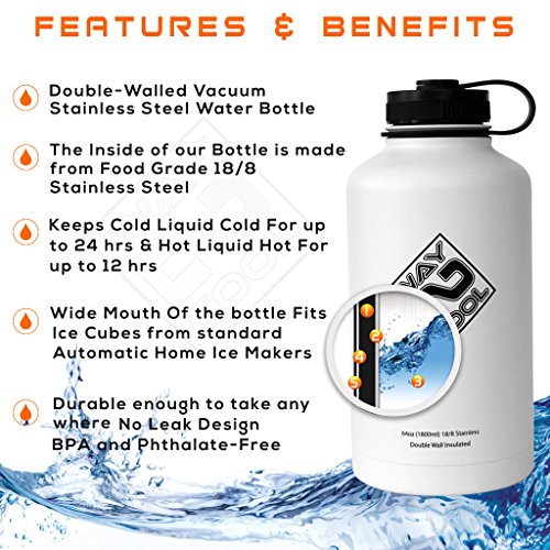 VACUUM INSULATED -Our 64 ounce Way 2 Cool Stainless Steel wide mouth keeps drinks fold for up to 24 hours and hot liquids up to 12 hours.GURANTEED NOT TO SWEAT - Our premium grade material will not "sweat" leaving that annoying ring of liquid on the table's surface.
